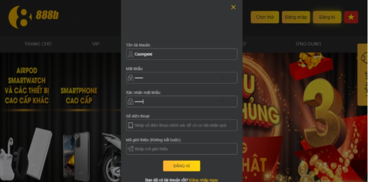 Cung cấp đầy đủ các thông tin cá nhân mà chúng tôi yêu cầu để có thể thực hiện quá trình đăng ký tài khoản bao gồm tên đăng nhập 888b, mật khẩu, số điện thoại, email,…